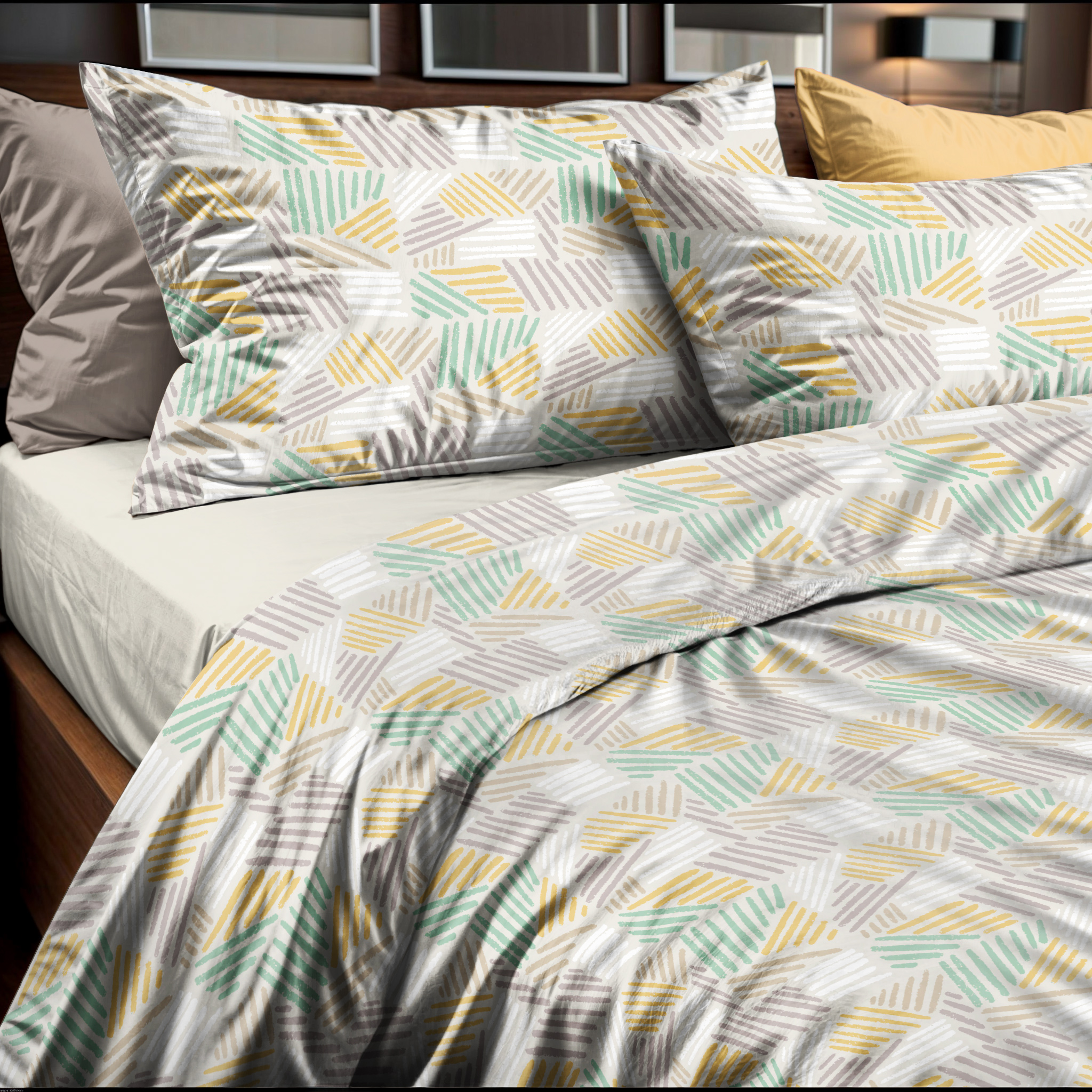 Completo lenzuola stampato, realizzato in cotone 100% tela 30×27, con decori geometrici e colori particolarmente alla moda, secondo le più avanzate tendenze internazionali.