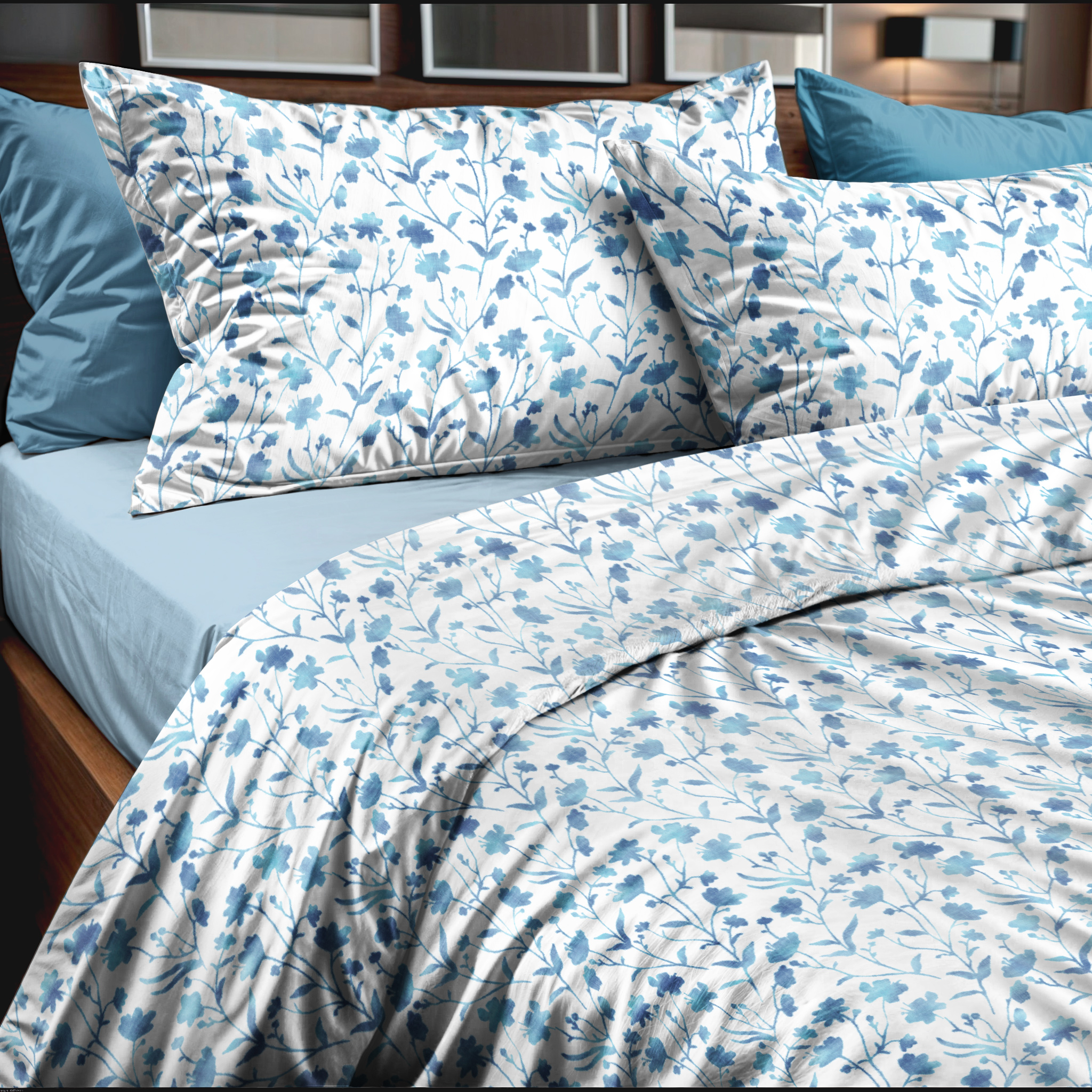 Completo lenzuola stampato, realizzato in cotone 100% tela 30×27, con decori fiorati e colori particolarmente alla moda, secondo le più avanzate tendenze internazionali.