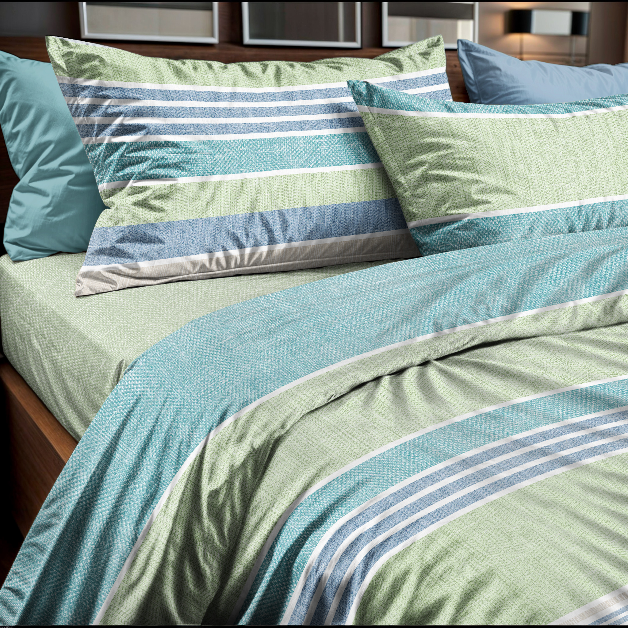 Completo lenzuola stampato, realizzato in cotone 100% tela 30×27, con decori geometrici e colori particolarmente alla moda, secondo le più avanzate tendenze internazionali.