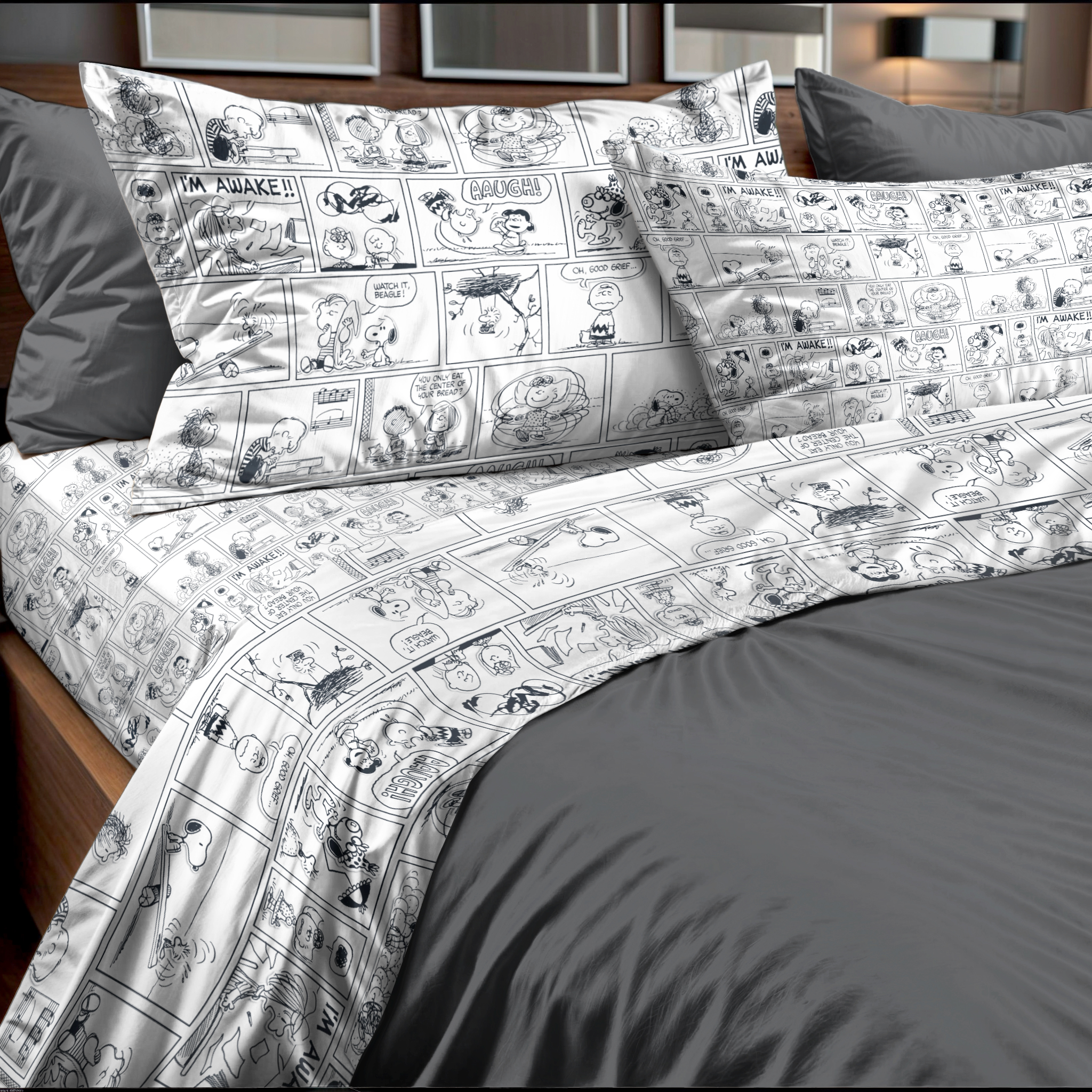 Completo lenzuola stampato su tela di cotone 30×27; con federa allover e decori che richiamano il simpatico mondo di Snoopy, nel 75mo anniversario della sua nascita nel 1950