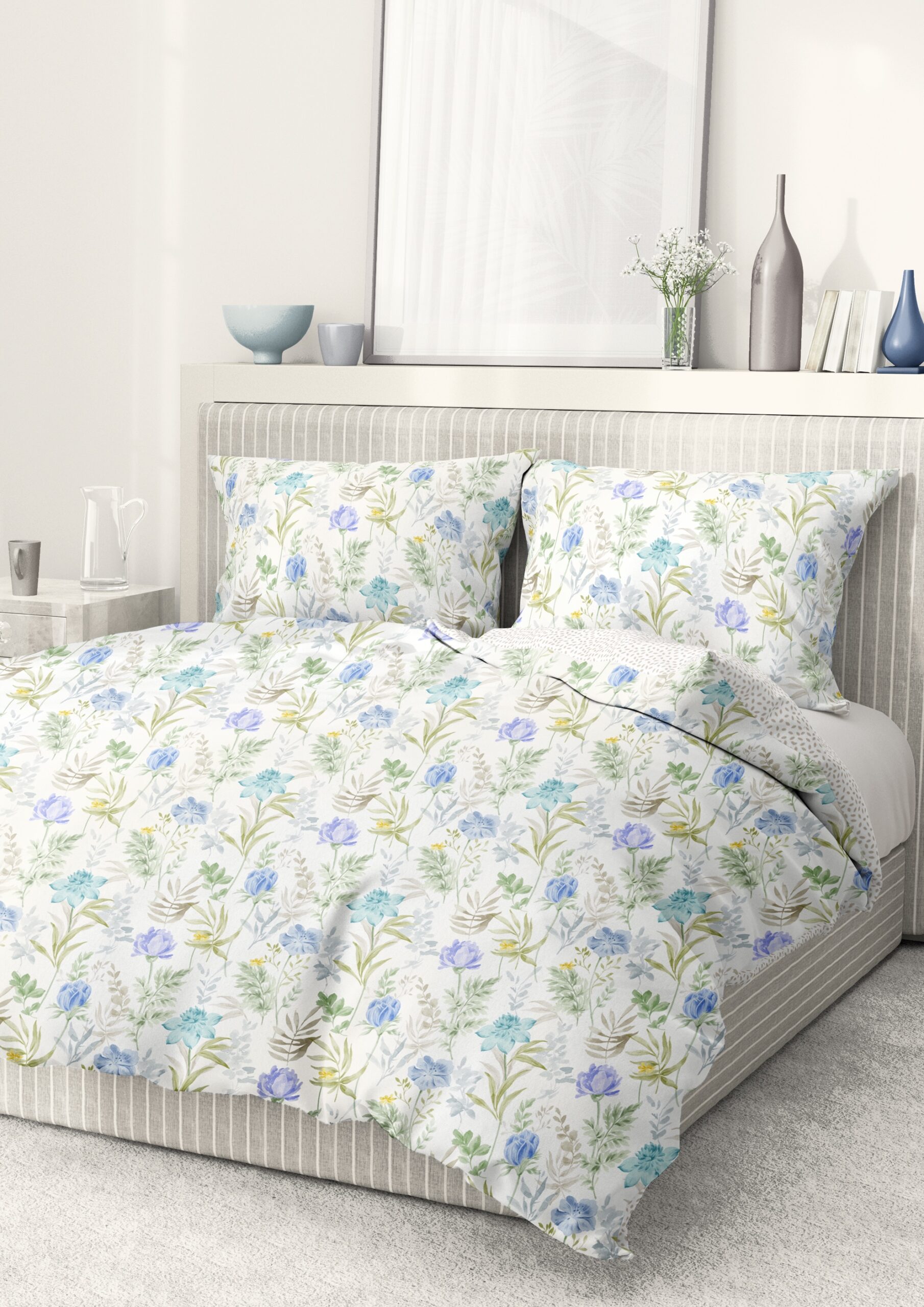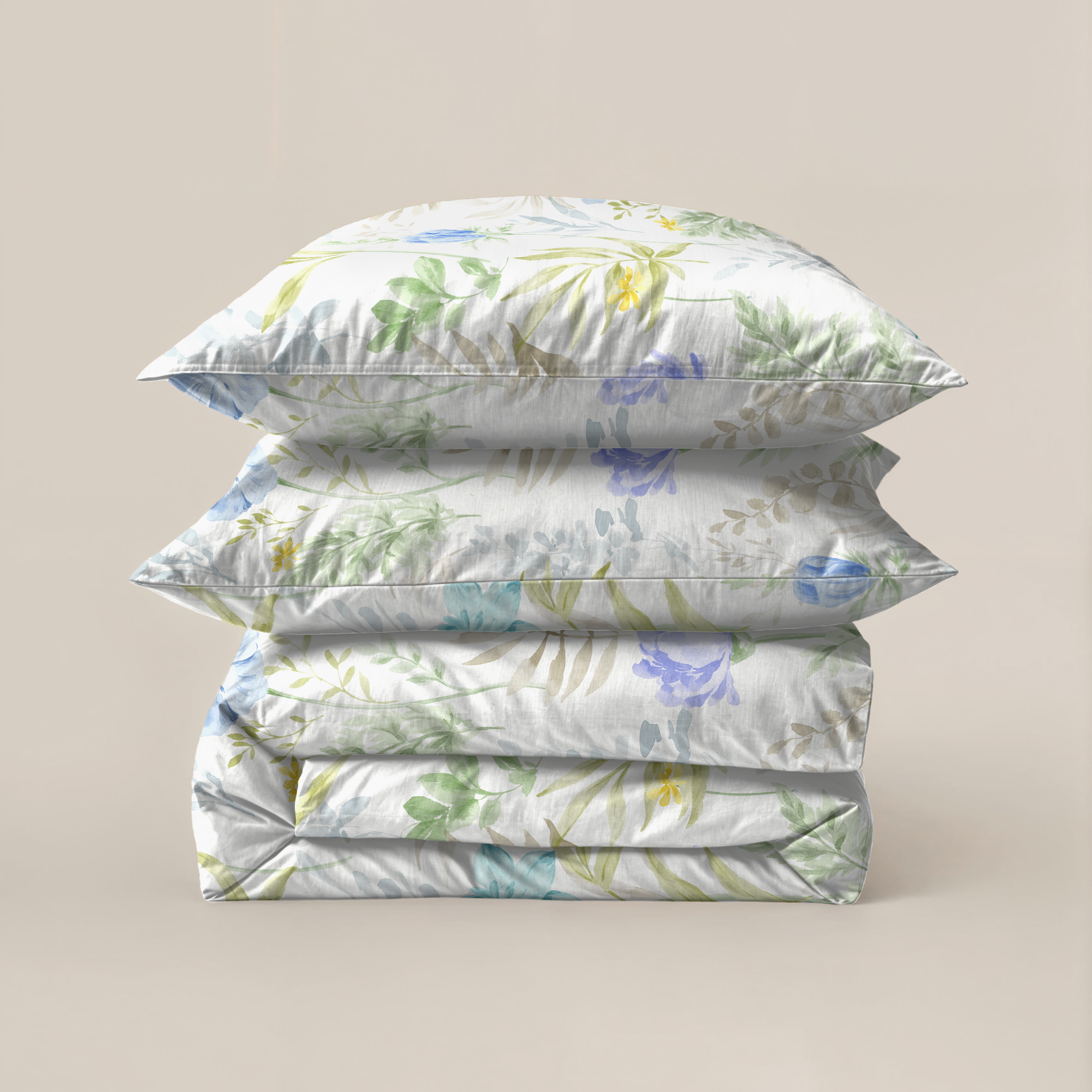 Parure copripiumino stampato, realizzato in cotone 100% percalle con decori floreali e colori particolarmente alla moda, secondo le più avanzate tendenze internazionali.